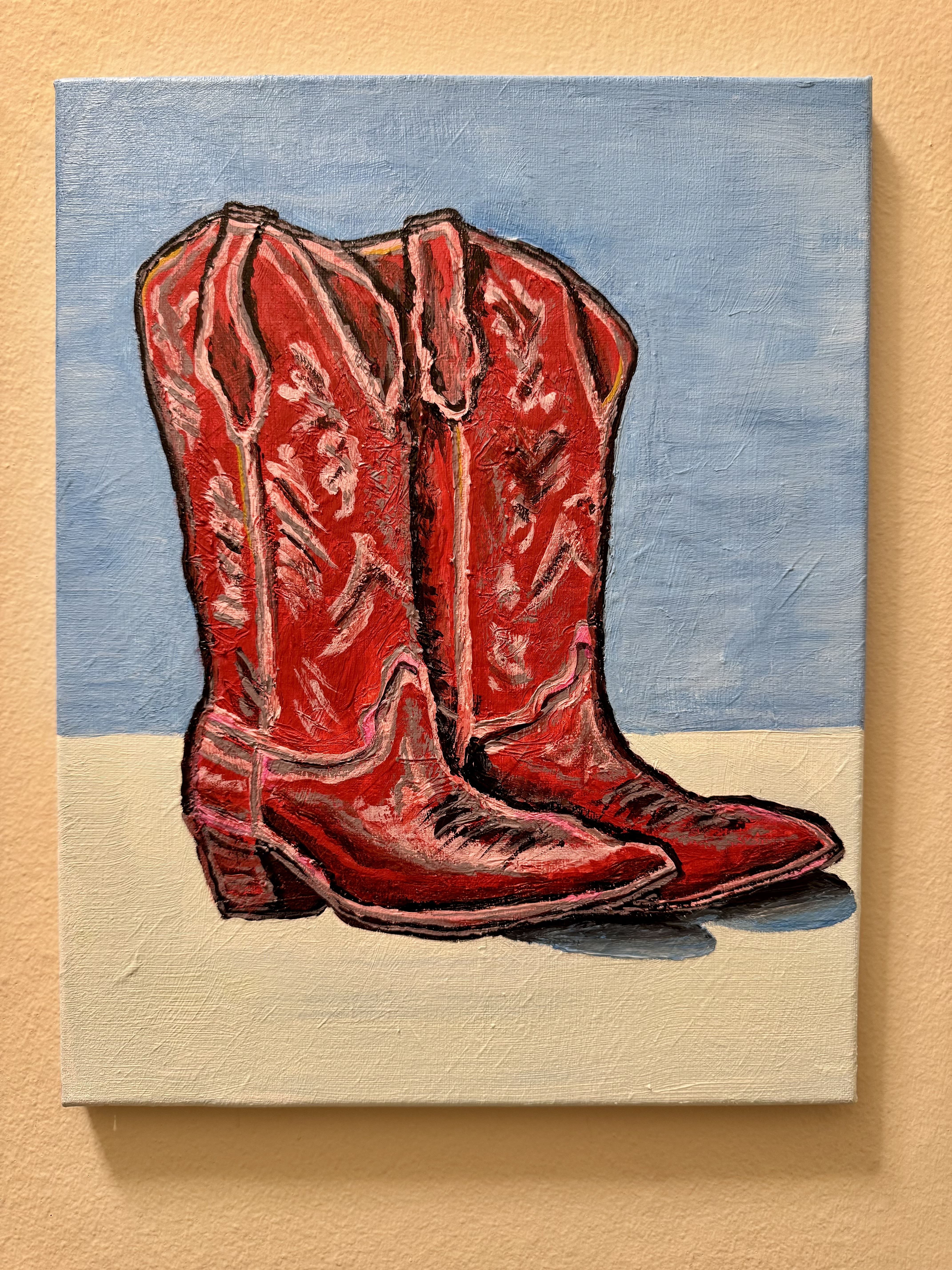 Howdy Cowboy. A western painting series that I’m currently working on. This work challenges traditional masculine stereotypes by reinterpreting cowboy imagery to critique conventional idealized narratives. I found myself needing to explore a personal conflict, being attracted to cowboys but also not wanting to further patriarchal symbolism.