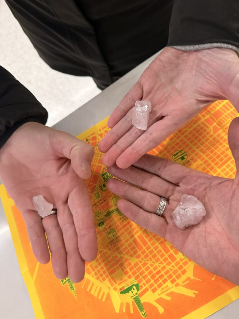 Later that very day, I was stationed at my pop-up kiosk at the Union Square Muni station, my kiosk business was barely a day old, when I looked up to see Heiko and Nicole. We laughed at the coincidence, and we all had the pink rose crystals from the Pink Triangle Park, which commemorates LGBTQ+ history in such a moving way. We even snapped a photo to send to Cathy, connecting the threads of our serendipitous meetings.
